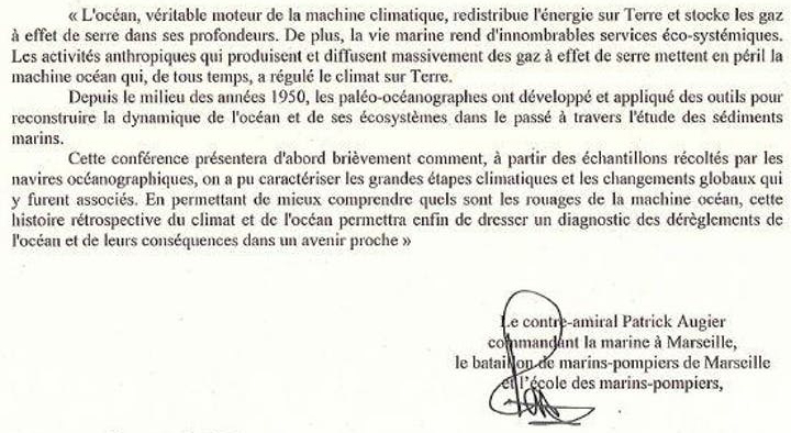 Un groupe d'adhérents pourra assister à la conférence mensuelle organisée par le contre-amiral Patrick Augier, commandant la Marine Nationale à Marseille, le Bataillon de Marins-Pompiers de Marseille et l'école des Marins-Pompiers. Le thème est "L'océan, moteur de la machine climatique" avec comme intervenant : Nicolas Leduc, Chargé de recherches au CNRS, Centre Européen de Recherche et d'Enseignement des Géosciences de l'Environnement - CEREGE.