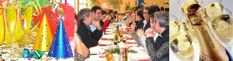 La règle est que l'adhérent (ou le couple d'adhérents) qui accueille fournit seulement le lieu et la vaisselle. Les autres convives apportent un mets de fête à partager et du champagne !