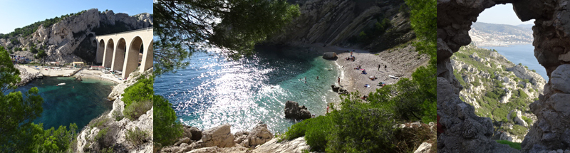 Nous arrivons tranquillement à la calanque de la Vesse ou les maisons semblent se blottir sous les arches imposantes du viaduc soutenant le chemin de fer de la côte bleue.
