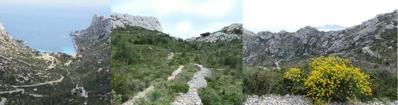 Nous cheminons avec une vue extraordinaire sur les calanques : le Baou rond, le mont Puget, la Grande Candelle, les îles de Riou, de Jarre et l’île Plane.