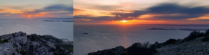 Le panorama sur Marseille, les Calanques et ses archipels est époustouflant ! Le nom donné à Marseilleveyre prends ici tout son sens.Le retour s’effectuera dans l’obscurité, par un sentier sans grande difficulté. Sensations garanties !