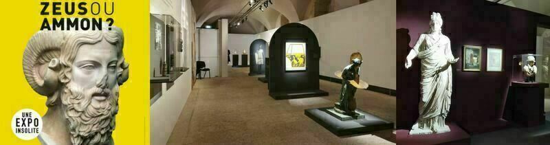 L'affiche de l'exposition : Tête de Zeus-AmmonLa chevelure est divisée par une raie médiane et se termine par un rouleau sur la nuque. La barbe fournie est constituée de courtes mèches désordonnées. Les cornes de bélier permettent d’identifier une représentation de Zeus-Ammon.