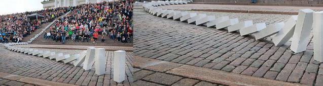 La dimension monumentale de Dominoes transforme la perception de l'environnement urbain tout au long du processus de construction. Plusieurs milliers de personnes se rassemblent et voient l'oeuvre prendre forme petit à petit, avant de prendre vie en fin de journée. Une journée qui promet d'être inoubliable, de la mise en place à la montée en tension graduelle qui précède la chute...