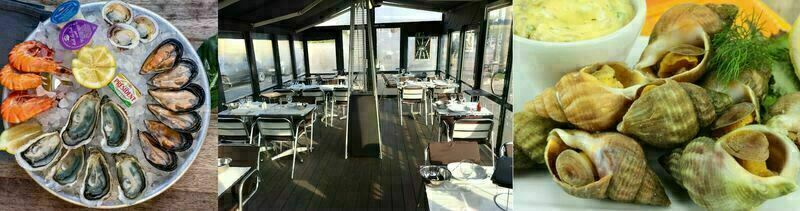 Vous y dégusterez des coquillages : Moules, Bulots, Palourdes, Amandes etc, des crustacés : crevettes, crabes, tourteaux, violets, oursins..., et surtout des huîtres : Isigny, Gillardeau, Fines de Claire, Bouzigues, Camargue, etc (en saison).