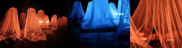 Singulière et suave proposition que celle de Bérangère Jannelle qui invite à une séance de lecture à des spectateurs allongés sur des lits de toile dans la pénombre propice aux rêveries et à la divagation de l’imaginaire. Écouter la littérature... Entendre les mots au plus près de ses oreilles dans un environnement de calme et de douceur.
