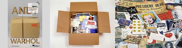 Les time capsules sont des boites en carton dans lesquelles Andy Warhol a rassemblé, année par année, les objets, matériaux, photographies, magazines....