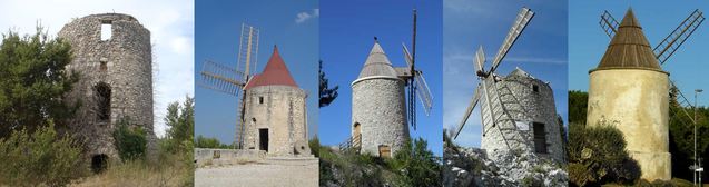En photo : Le moulin de la Coquillade de Puyricard (en ruine), celui restauré de Fontvieille (dit "moulin de Daudet), celui d'Allauch, celui de Pennes-Mirabeau, celui de Plan-de-Cuques.