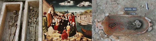 En illustration : Sarcophages découverts lors des fouilles de la rue Malaval à Marseille et peinture sur bois du peintre italien Ronzen (fragment de retable dédié à Marie-Madeleine, dont le culte à Marseille et dans la région était très important depuis le Moyen Âge). Elle est datée du début du XVIe siècle. © Collection du Musée d'Histoire de Marseille.