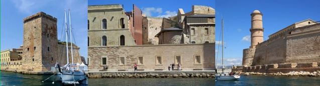 Arriver au Fort Saint Jean côté tour du Roi René (carrée) par le port côté arrêt de bus Capitainerie.