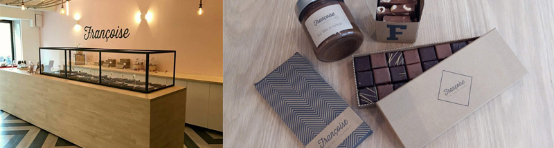 A seulement 25 ans, elle se lance le pari audacieux d’ouvrir sa propre chocolaterie et lui choisi pour nom celui de son arrière grand-mère. Mais cet hommage est bien sa seule référence au passé. De la cuisine laboratoire ouverte sur la boutique, au design épuré des tablettes, jusqu’aux noms des produits réduits à leur plus simple description, Céline ancre délibérément les lieux dans la modernité.Elle se fournit chez le célèbre chocolatier Valrhona et imagine des recettes artisanales innovantes qui dressent la part belle aux produits régionaux comme le miel ou le thym. Tantôt brut, sans détour, rehaussé de touches féminines et généreuses, tantôt frais et sucré avec ses arômes 100% naturels de pulpe de fruits, chez Françoise le chocolat se croque selon les goûts, en tablette ou en bonbons.
