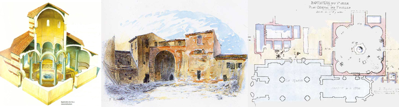 Ci-dessous, aquarelle de F. Roustan : La cour de la prévôté de l'ancienne Major, côté Ouest, où furent découverts les ruines de l'ancien baptistère.